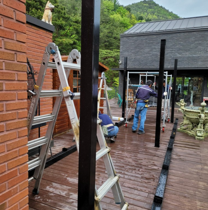 오늘 설치사례는 태양광캐노피를 강원도 홍천에 있는 펜션에 설치해드렸던 현장입니다. ![]() 분위기있는 펜션답게 헨젤과 그레텔에 나올것같은 나무로 만든 미니미니한 집들이 여러 채 있었고요. ![]() 그렇게 미니미니한 집 바로 앞은 바로 하늘이 뻥 뚫린 덕에 나무로 된 데크가 있음에도 활용도가 떨어지는 것이 문제였답니다. ![]() 해수욕장에 가서 파라솔이 있고없고가 모래사장에서 쉬는데 무척이나 결정적인 영향을 끼치는 것처럼 이런 펜션의 경우도 나무 데크위에 지붕이 있느냐 없는냐가 이곳의 활용도를 결정하는 매우 중요한 역할을 합니다. ![]() 그렇기에 태양광캐노피 전문기업인 저희 태웅솔라에서 건축법의 영향을 1도 안받는 태양광발전시설이면서 지붕과 같은 캐노피의 역할을 충실하게 할 수 있는 방수천장을 만들어 드렸답니다. ![]() 태웅솔라는 태양광시설 전문기업으로 태양광캐노피 구조물을 직접 분체도장하여 현장에서 설치를 해드리고 있는데요. ![]() 블랙이나 화이트로 분체도장을 한 구조물은 방수는 물론이고 시각적으로 볼 때도 펜션과 매우 잘 어울리는 장점이 있답니다. ![]() 이렇게 기둥을 먼저 세운 후에 수평자등을 이용하여 수직, 수평을 맞춘 후에 거더를 얹으면 기본적인 구조물이 모두 완성이 됩니다. ![]() 그리고 나서 빗물받이를 설치한 후에 태웅솔라에서 시공하는 태양광캐노피의 핵심기능을 수행하는 양면그라스모듈을 얹습니다. ![]() 양면그라스모듈은 태양빛을 받아 발전을 하기도 하고 양면이기에 빛 역시 투과되어 캐노피아래에서도 전혀 답답함없이 여유를 즐길 수 있답니다. ![]() 무엇보다 일반 캐노피는 건축법상 불법으로 적용을 받지만 태양광캐노피는 전기시설로 분류되어 문제가 전혀없는 꿀장점이 있고요. ![]() 캐노피아래에 레일등을 달아서 낮시간대뿐 아니라 밤시간대에도 어둡지않게 활용하실 수 있게 해드렸네요! ![]() 태웅솔라는 태양광전문기업으로 자체적으로 분체도장한 구조물들로 시공을 합니다. 양면그라스모듈을 이용하여 탁월한 태양광시설물들을 전국적으로 설치해드리고 있습니다. 오랜 경력으로 오차없이 무결점시공해드리고 있으니 편하게 문의주세요~ 문의 1855-4688 / 010-9700-3445 |