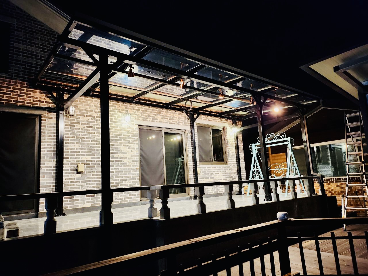 해가 지고 어두워지자, 준비해 두었던 LED 조명이 자동으로 켜졌습니다. 패널 아래쪽에 간접조명처럼 설치된 전등들이 은은하게 빛을 내면서, 테라스가 정말 멋진 야경 명소로 탈바꿈했습니다. 태양광 캐노피, 정말 만족스러웠어요!