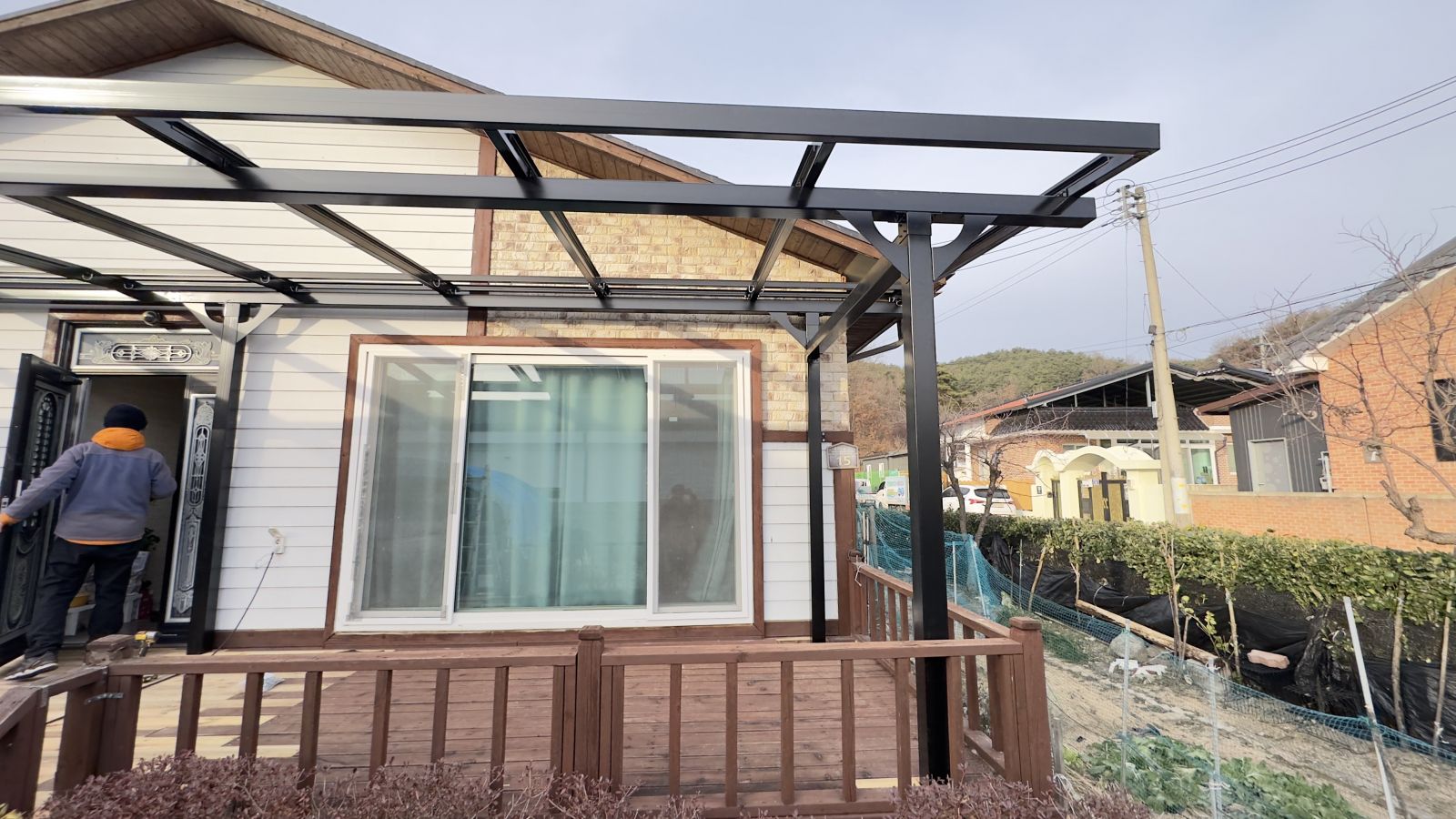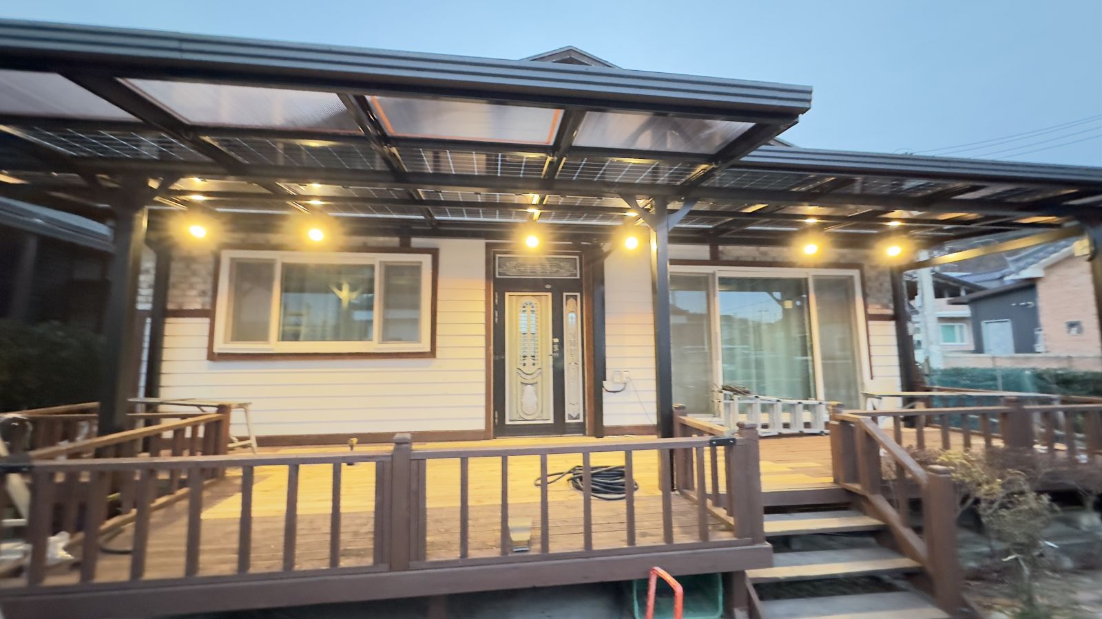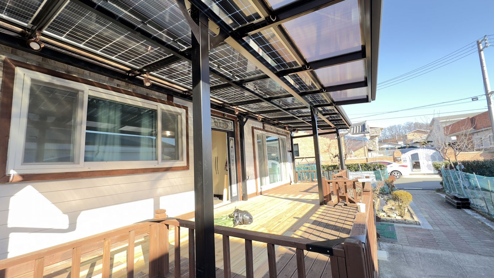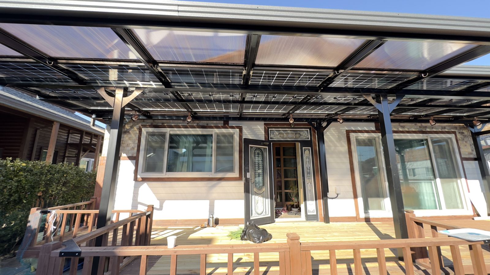 태양광캐노피 시공전의 모습입니다. 출입구 데크가 앞면을 가득 채우고 있습니다. 햇빛그늘막이 필요하고 비오는 날에도 넓은 데크를 사용할 수 있는 방법은 '태양광캐노피' 설치입니다. 3D동영상 무료견적