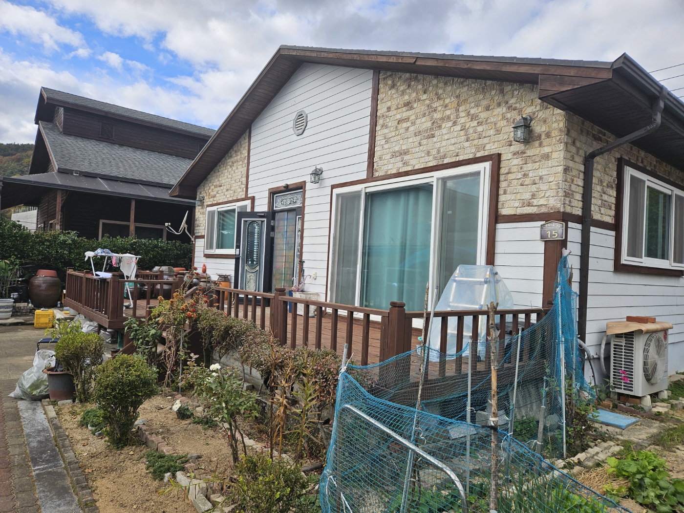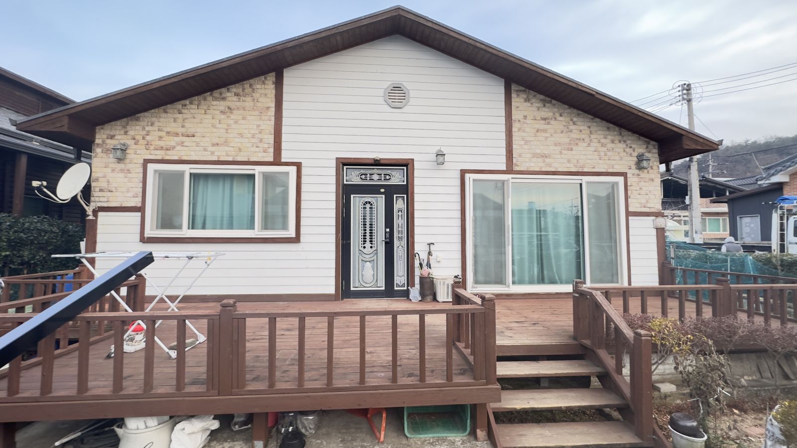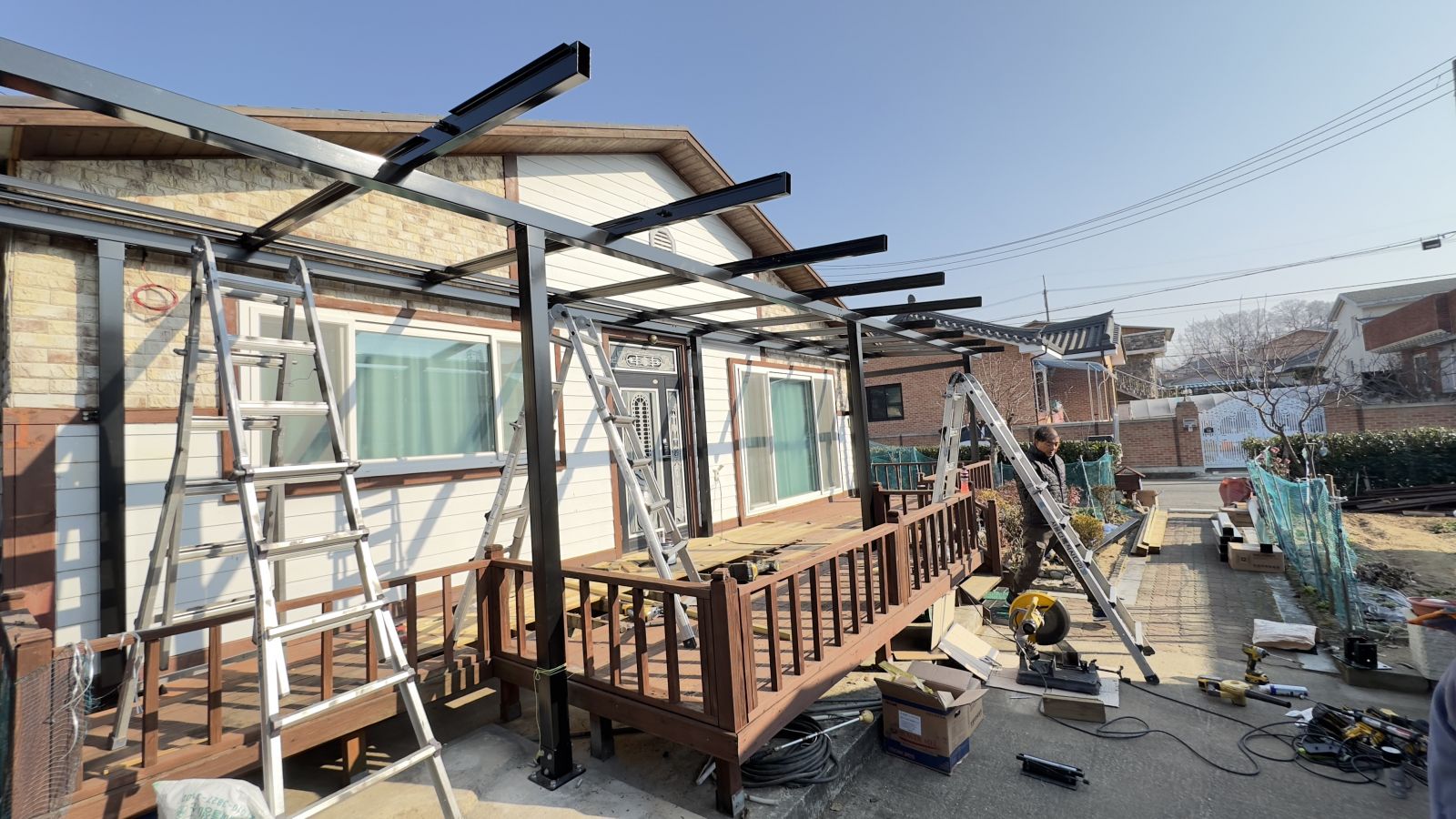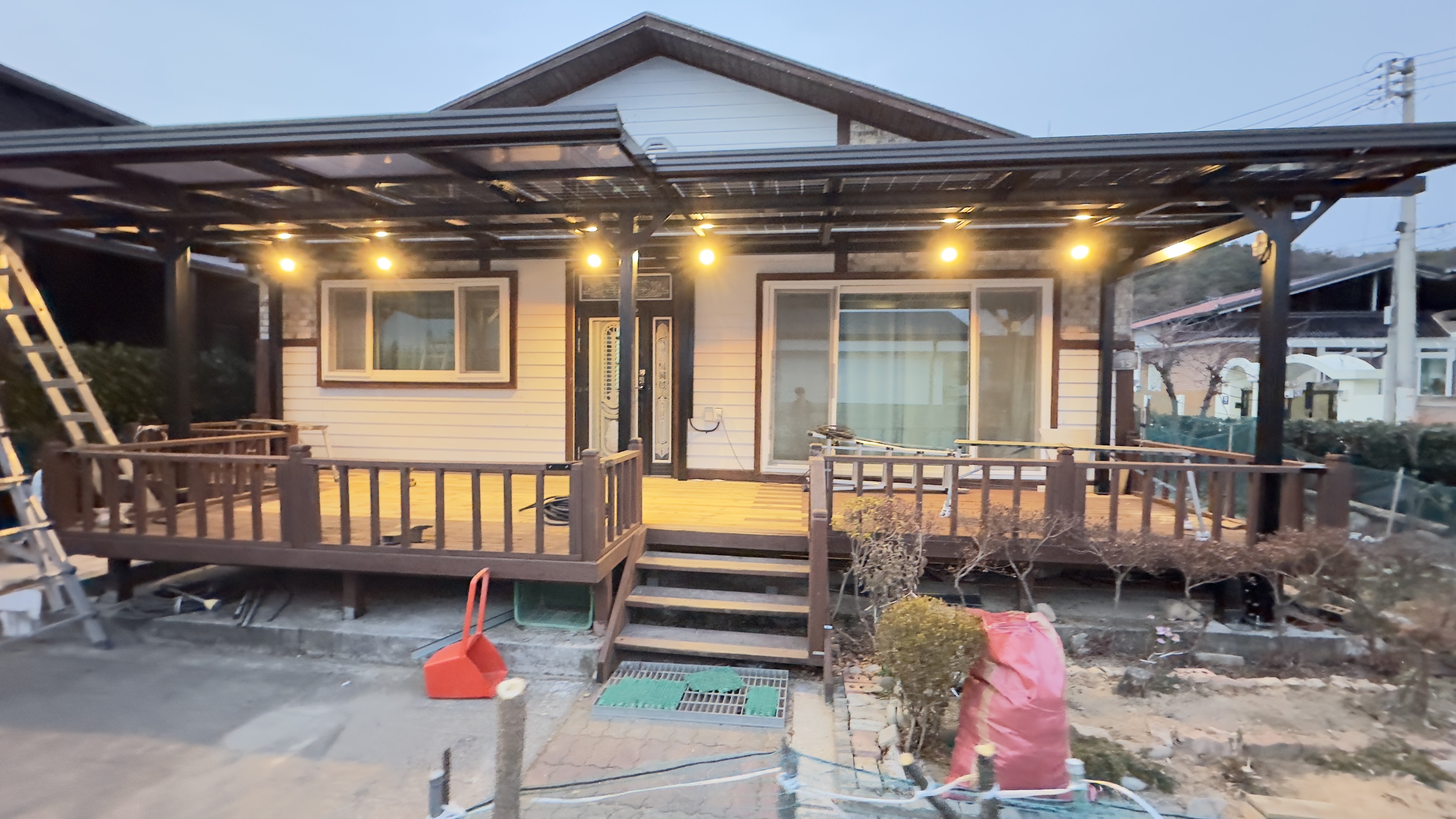 태양광캐노피 시공전의 모습입니다. 출입구 데크가 앞면을 가득 채우고 있습니다. 햇빛그늘막이 필요하고 비오는 날에도 넓은 데크를 사용할 수 있는 방법은 '태양광캐노피' 설치입니다. 3D동영상 무료견적