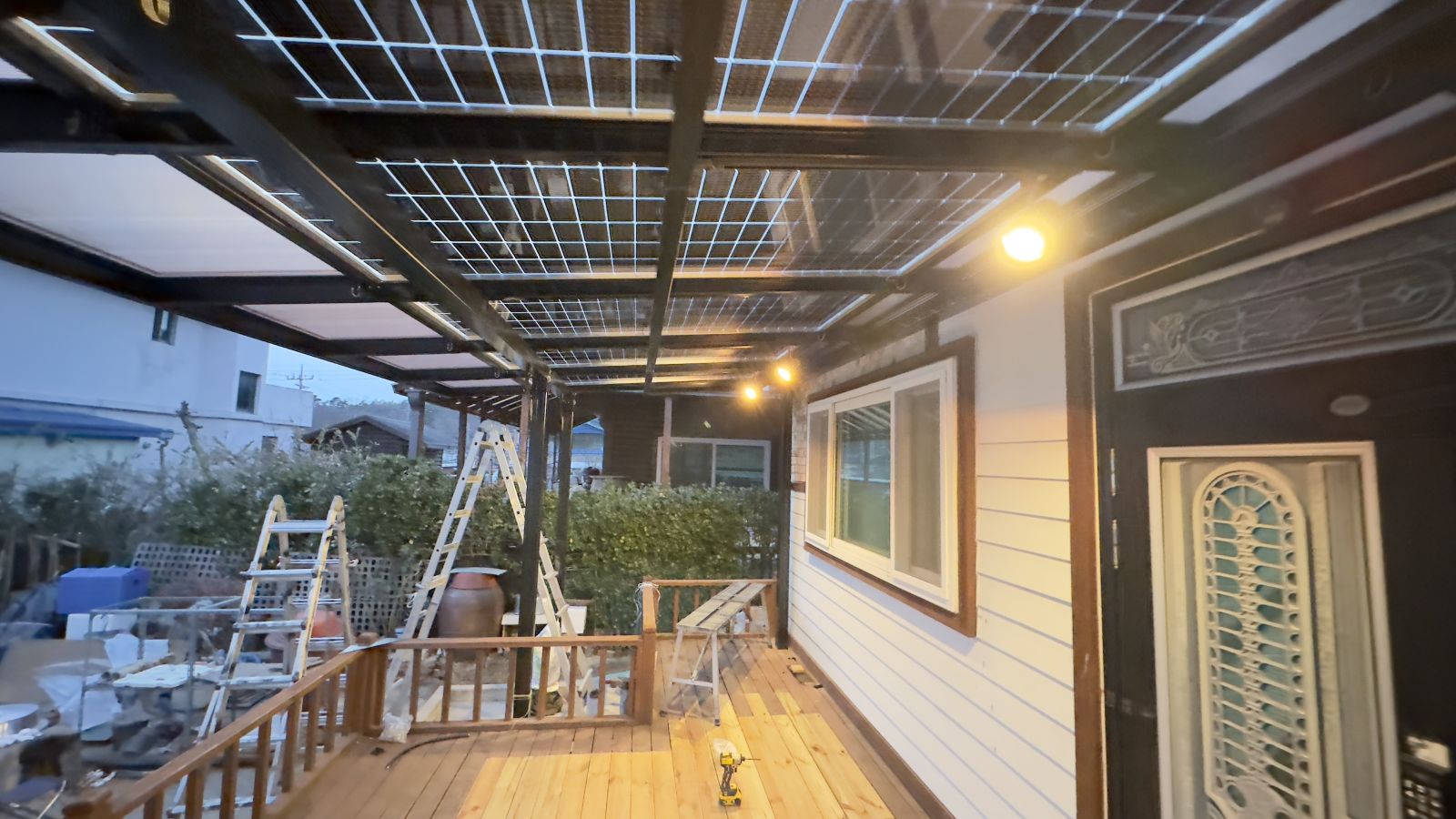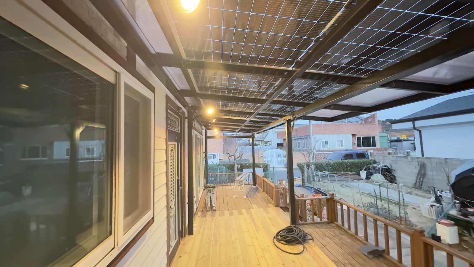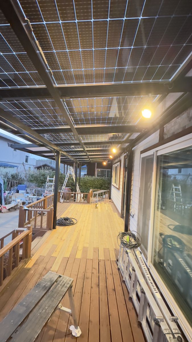 야간에 다용도 활용 면에서 최고급 LED 레일 등도 장착해 드렸습니다. 방수태양광이라 비나 눈이 와도 여유롭게 공간활용을 할수 있기에 가족 분들이 참 좋아하십니다. 빗물 받이를 위해 물받이도 시공 해드렸습니다. 인버터 시공