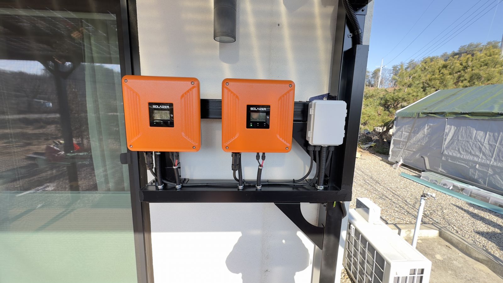 ![]() 인버터는 건물 외벽에 설치를 합니다. 태양광 인버터는 까다로운 검사를 '합격'한 검사성적서를 가진 우수한 제품만을 사용합니다. 양면그라스 모듈은 일반모듈보다 생산이 높아 인버터를 설치하여 전기요금을 절약할 수 있습니다. 태양광 캐노피 시공 후