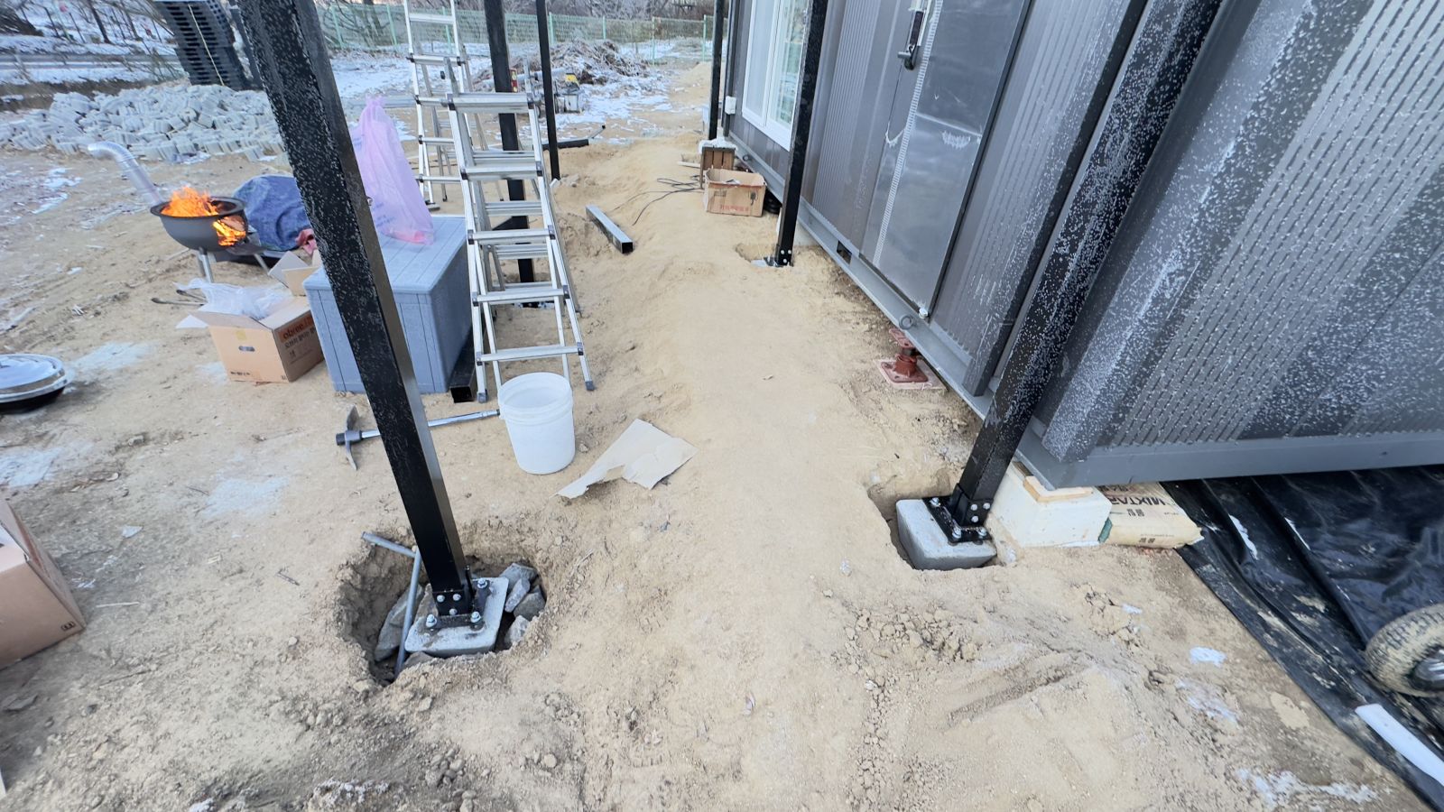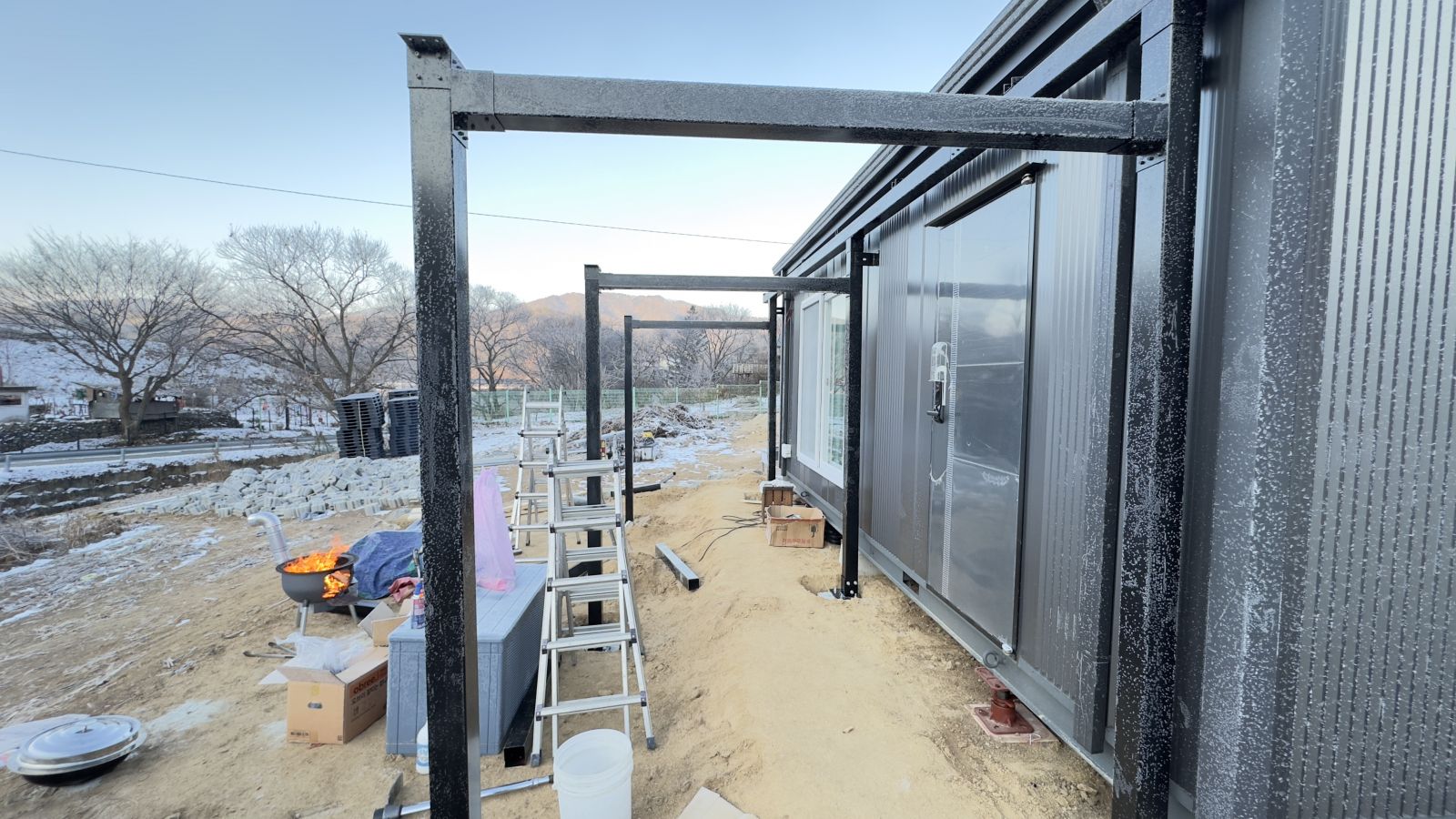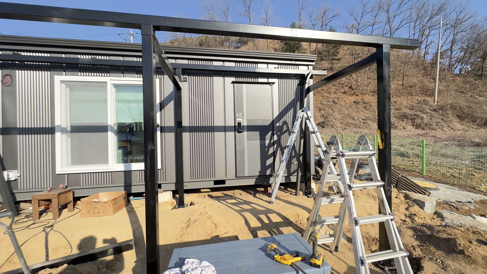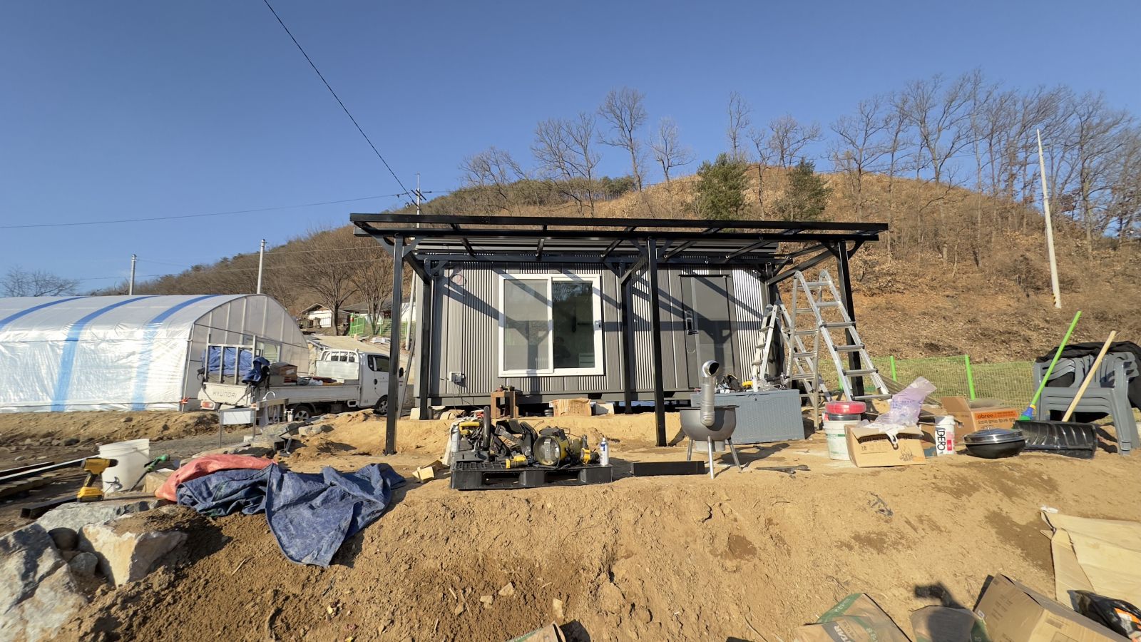 시공전의 전경입니다. 컨테이너 농막입니다. 전기를 마음편히 사용하고 싶고 햇빛그늘막도 필요하고 비오는 날에도 출입구를 사용할 수 있는 방법은 '태양광캐노피' 설치입니다. 3D동영상 무료견적